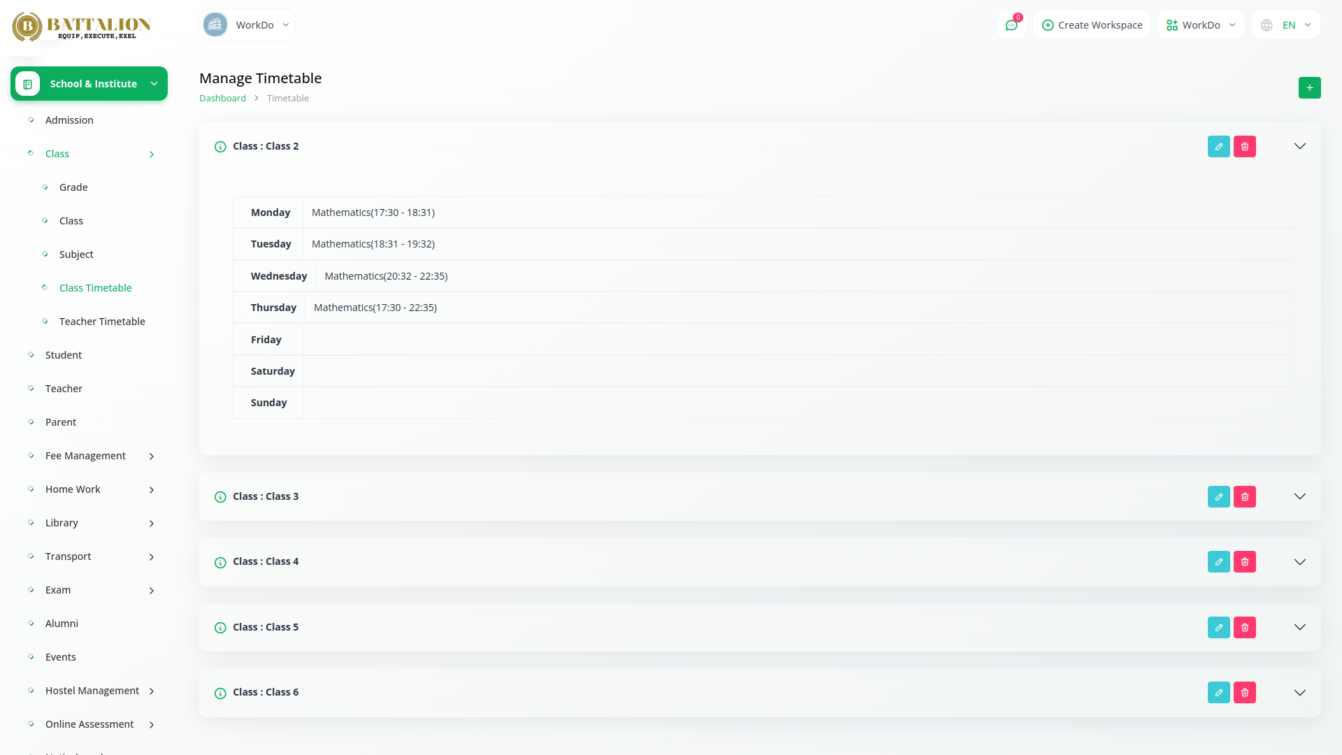 Battalion’s Class Management feature offers administrators a complete overview of the academic framework in one streamlined interface. Easily manage classes, assign subjects, configure class and teacher timetables, and oversee academic scheduling with precision. With the flexibility to edit or remove entries as needed, administrators can make real-time adjustments, ensuring the academic structure stays aligned with institutional goals and evolving requirements.
