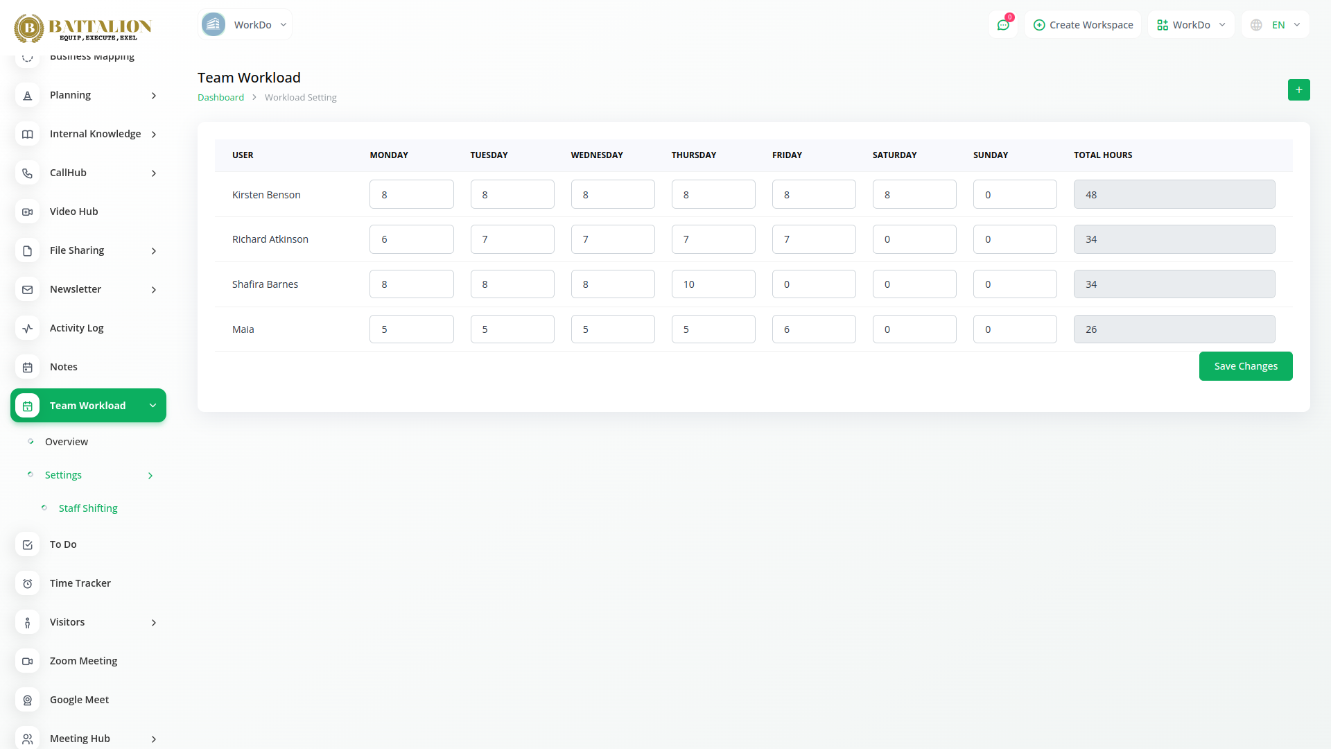 With Battalion’s Team Workload Module, gain full visibility into each employee’s weekly capacity by comparing their available working hours against actual hours spent across assigned tasks.