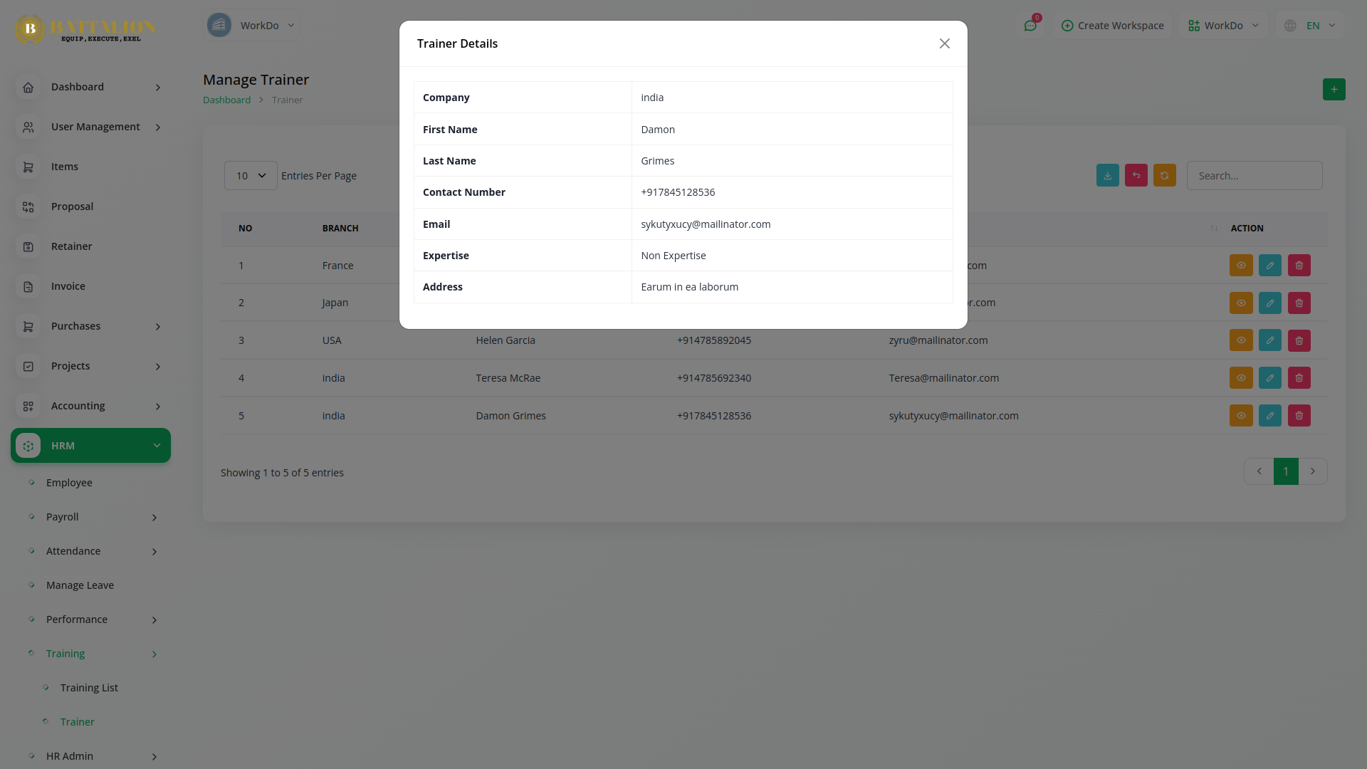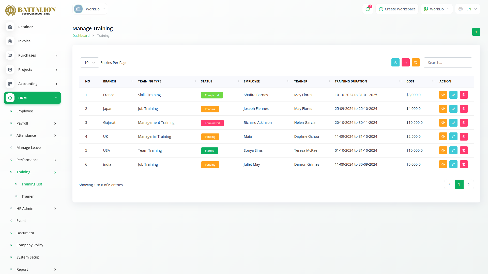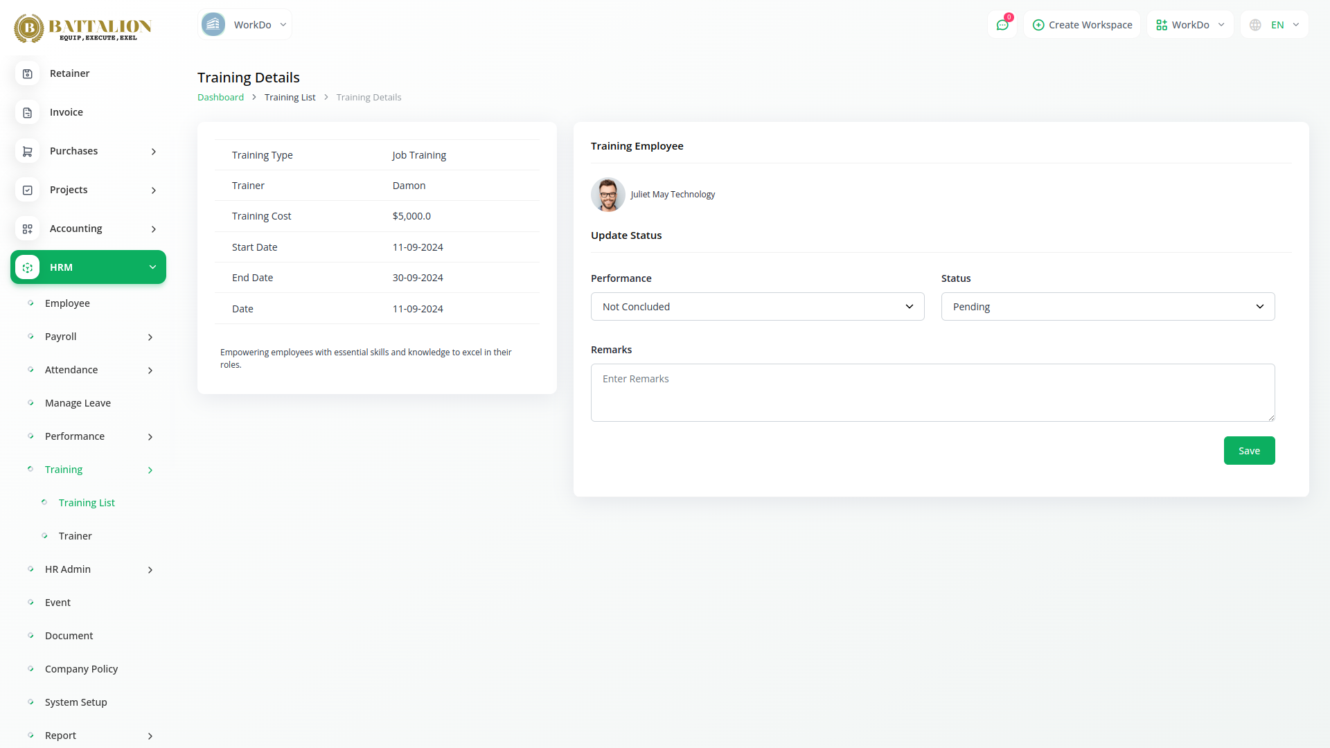 Employee training is essential in today’s dynamic work environment. With Battalion’s HRM Module, you can efficiently manage and monitor all training activities by assigning specific details such as cost, duration, training type, and mode for each employee. Maintain a streamlined overview of your training programs, and keep an organized list of trainers with the module’s easy-to-use trainer listing feature-ensuring every learning initiative is well-tracked and effective.